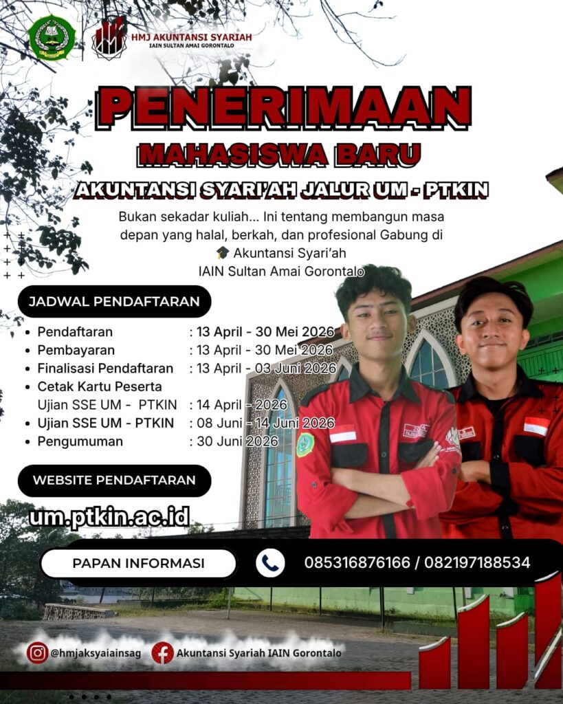 Saatnya bergabung bersama Akuntansi Syari’ah IAIN Sultan Amai Gorontalo dan menjadi bagian dari generasi unggul yang berintegritas serta berlandaskan nilai-nilai Islam.